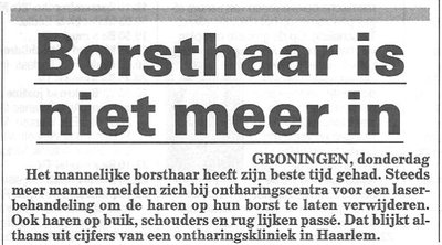 Het mannelijke borsthaar heeft zijn beste tijd gehad. Dit nieuws, prominent op de voorpagina van De Telegraaf, staat momenteel op nummer een van onze komkommerlijst. (Met de diefstal van vader Abrahams bolhoed op een goede tweede plaats.) Wanneer beleefde het mannelijk borsthaar zijn beste tijd? In de jaren zeventig. Toen de overhemden ruches hadden en tot de navel openstonden. Ik heb weinig haar, dus ik dacht dat ik met een uurtje ontharingskliniek wel uitkwam - blijken alle ontharingsklinieken wachtlijsten te hebben! Schande! Kan de nieuwe regering hier iets aan doen? Het is toch te gek dat je voor je ontharing naar het buitenland moet?