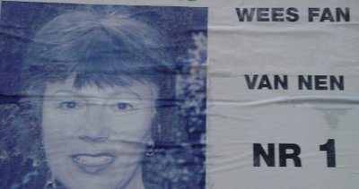 Gestemd! En ik heb er werk van gemaakt. Tot het te donker werd, trok ik langs de aanplakborden in mijn gemeente, om de hoofden van de kandidaten te bestuderen. Uiteindelijk hield ik er twee over. Twee vrouwen, want politiek gezien ben ik een kiezer van de degelijk correcte soort. De strijd ging tussen Mimy en Nen. Een moeilijke keuze. Mimy presenteerde zich uitsluitend als hoofd en Nen had aan het hare tekst toegevoegd. Na lang aarzelen zwichtte ik voor de politieke boodschap van Nen. Ik, die nooit fan van iemand was geweest, besloot de komende vier jaar haar fan te worden. Bovendien was ze nummer 1 en dat stemt wat gemakkelijker als je in het stemhokje op de bovenste naam van een lijst kunt drukken. Sorry Mimy, je hebt een prachtig, krachtig, kleurrijk hoofd, maar ik weet niet of je het op prijs zou stellen als ik fan van je werd. Nog vanavond ga ik naar Nen op zoek om een handtekening te vragen.