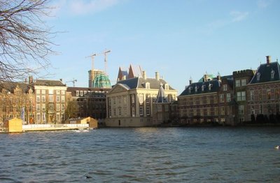 ?Die foto bovenaan Bieslog, waar is dat?' Het Nieuwe Centrum van Den Haag. De strook groen onderaan: het Malieveld. De puntdaken: het Ministerie van VWS ('de tieten van Den Haag'). De raket ervoor: een verzekeringsmaatschappij. De bouw duurt al jaren en zal nog jaren vergen. Het Nieuwe Centrum komt waarschijnlijk nooit af. Hiernaast een foto van de andere kant. De Hofvijver, rechts de kamergebouwen. In het midden: het torentje van Kok. Symboliek? Zoveel je maar wilt. De oude bolwerken worden overruled door de nieuwe funbouw.