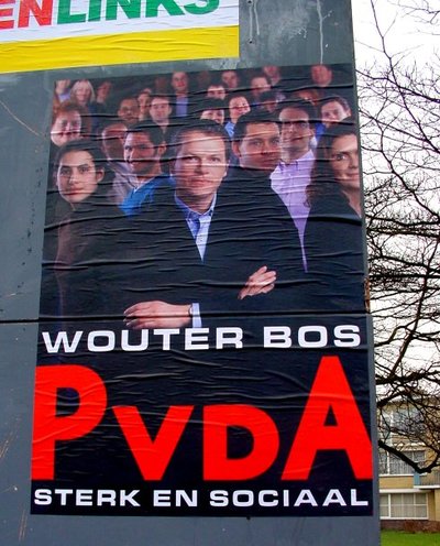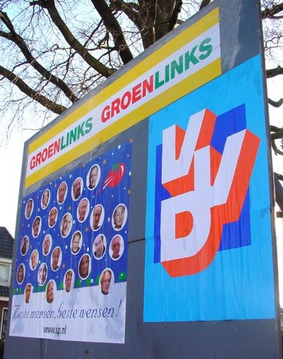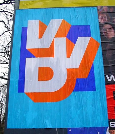 Geen gezichten, geen slogans, altijd diezelfde knallende kleuren. Je krijgt de indruk dat de VVD, bij de oprichting in 1948, tien miljoen affiches heeft laten drukken en er nog vele jaren mee voort kan. Verondersteld wordt dat de kiezers wel weten waar de VVD voor staat. 'Zoek het zelf maar uit', zegt dit affiche. En die opvatting past precies bij de VVD. De VVD is de enige partij die ook de achterkant van de borden laat beplakken. Handige jongens en slimme meiden, die VVD-ers.