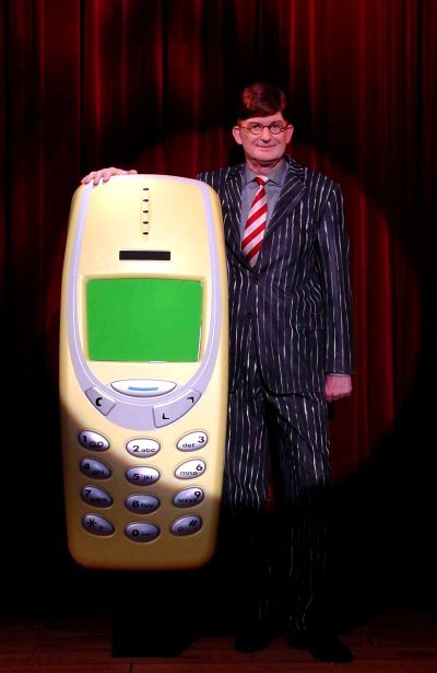'Het is eigenlijk te vroeg, maar ik gun u een ekskloesif kijkje op het prototaip. De onder leiding van prof. dr. B. Vingerling ontworpen noew series mobails bevat m-mode, zet miens, dat er telefonisch menselijk verkeer mee mogelijk wordt. HMT dus - Joemen Mobail Trènsmissiun. HMT heeft de fjoetjur. Fotootjes met je mobail maken en per iemeel versturen... ach, het is allemaal wel geinig, maar je bent gauw op die vage plaatjes uitgekeken, zèts over en out. Met de F804-77 kan de mens zodanig didsjetol worden gecomprimeerd, dat hij per telefoonlijn kan worden verzonden. Groot? Ach, welnee, hij is inflèttubbel. Heel veel wordt namelijk inflèttubel in toezauzendsrie. Dat wil zeggen je draagt 'm in je binnenpokkut, je blaast hem op, je neemt er in plaats, je tikt een nummer in, tuts Sent en huppetee jor kon! De 77-serie met m-mode komt in maart 2003 op de markt en we verwachten een joetsch zuckcès, uh smèsjing hit! Heeft directeur Welling van de Nederlandse Bank niet zelf gezegd dat de economie in 2003 weer gaat aantrekken? Okee. Hie zees it, wie doe it!' Teleman (Bob van der Lint, sales promotor PhonyCom BV) 'Nog even dit: Het pródjekt is zó siekrut dat we met de andere foonkompenies nog geen prijsafspraken hebben kunnen maken!'