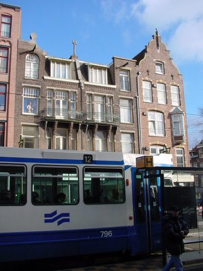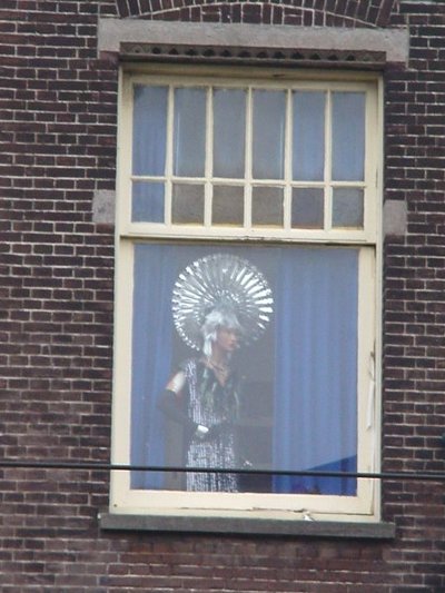 Twaalf november jongstleden meldde ik u, dat ik die middag door Amsterdam liep en, onder invloed van de meegevoerde fotocamera, naar de gevels omhoog keek en een vrouw zag staan. Een fraai aangeklede pop. (Zie 'alles van november'.) Waarom stond zij daar? Ik kon niet kiezen tussen grap of drama. Vanmiddag liep ik weer door die straat.