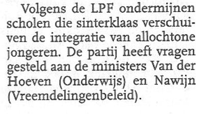 Hou er mee op!!! We kunnen het niet meer aan!! Krijgen we de komende dagen in alle journaals en nieuwsrubrieken weer LPF-mannetjes te zien, omgeven door cameraploegen, die kandidaat, kandidaat-af, of kandidaat-weggestuurd zijn? Wat doen ondertussen die 23 LPF-kamerleden? Hard werken aan de Nieuwe Politiek? Ze stellen vragen over Sinterklaas. Op 99,9% van de basisscholen geeft het samenvallen van Sinterklaas met het Suikerfeest geen enkel probleem - alleen een paar oerdomme ouders maken de moeilijkheden die er niet zijn. Vragen stellen aan twee ministers. Over een belangrijk maatschappelijk vraagstuk. De toevalligheid dat Sinterklaas en Suikerfeest op 5 december samenvallen, doet zich over 35 jaar pas weer voor. In een grappig krantenkadertje zal in 2037 nog eenmaal worden gerefereerd aan de LPF. De dienstdoende redacteur (die nog geboren moet worden) zal zich op het hoofd krabben. 'Allemachtig! Waar ging dat toen over!' (Latere aanvulling. Een zeer attente lezeres meldt: 'Nee, het is veel erger! Het is echt een 'als-pinksteren-en-pasen-op-één-dag-vallen' verhaal! Het is pas over 350 jaar!! Dus de enige die in 2352 nog met zekerheid leeft is de Goedheiligman zelf ...')