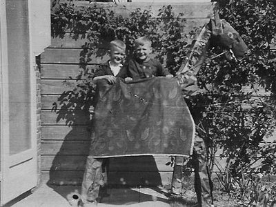 Dit is de dag van het onvervalste sentiment, dus ik mag even uitpakken, toch? Ben ik (links) hier acht jaar en is mijn boezemvriendje-uit-de-straat Henk dus negen? Alle feestdagen vierden we samen en voor deze vijfde december hadden mijn ouders en Henks moeder bedacht, dat de pakjes niet in een zak, maar in een zelfgemaakt Sinterklaaspaard zouden worden geborgen. Dat gedetailleerde paardenhoofd, de uitgeknipte manen... ze zullen er meerdere avonden mee in de weer zijn geweest. Die avond, zeven uur, bellen, kloppen op het raam... een paard voor de deur! Er werd een trappetje voor het beest geplaatst en om beurten mochten Henk en ik een pakje uit het paard tillen en de naam voorlezen. Het was Henks beurt. Hij hield een groot pak omhoog dat, gezien de vorm, duidelijk een wapen bevatte. Een speelgoedgeweer? De opwinding steeg Henk naar het hoofd, hij las de naam en er rolde een spontaan 'Godverdomme!' uit zijn mond. WIM, stond in grote letters op het pak. Aan de zijkant van de houten mitrailleur zat een wieltje en als je er aan draaide weerklonk een knetterend geratel. Henks hoofdcadeau was een houten boerderij met stenen schaapjes en koetjes. Hij vond het prachtig. En hij mocht af en toe ook met mijn mitrailleur ratelen. De foto is duidelijk in het voorjaar genomen. Het paard zal een paar maanden in het tuinschuurtje hebben gestaan en omdat er nog één foto op het rolletje zat, heeft mijn vader het beest, voor het werd afgebroken, nog even vereeuwigd.
