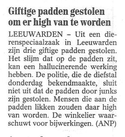 Schandalig hoe in bijgaand artikeltje mensen die aan padden likken met junks in verband worden gebracht. Ik ken veel mensen die aan padden likken; mensen uit alle lagen van de maatschappij - er zijn advocaten onder, stukadoors, doktoren, verkeersagenten, tuinarchitecten. Mensen die het prettig vinden in hun vrije tijd af en toe eens een padje te likken. Die het likken niet overdrijven en die zich bewust zijn van de bijwerkingen na overmatig likken (pas als men gedurende drie dagen achtereen padden zou likken, treedt blijvende blindheid op). Dat de politie van Leeuwarden nu alle liefhebbers over één kam scheert is voor veel bonafide paddenlikkers niet te verteren. Laat men voor een betere beveiliging van de dierenwinkels zorgen, zo luidt de meest gehoorde klacht. Camera's! Extra surveillance! In wat voor land leven we, als de burgers niet eens meer aan hun padden kunnen likken!