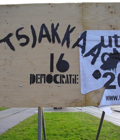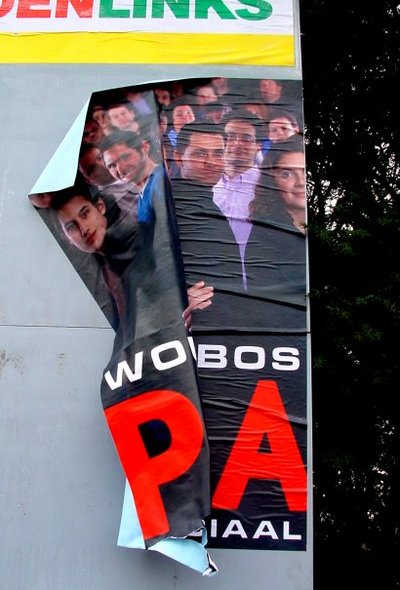 De lijsttrekker - wiens naam we gelukkig niet hoeven te noemen - had nauwelijks de tijd een partij op te richten, laat staan affiches te drukken. In plaats van plakkers stuurt hij er spuiters op uit. Ook over de slogan is niet lang nagedacht. Democratie - ja, hè hè, slapper kan het niet. Als hij had bedacht Weg Met De Democratie zou de leuze pas opvallen. Het bekladden van aanplakborden, die zijn bestemd voor algemeen gebruik, lijkt overigens een ondemocratische daad. Wedden dat meneer kabaal gaat schoppen als over het spuitsel een affiche wordt geplakt?