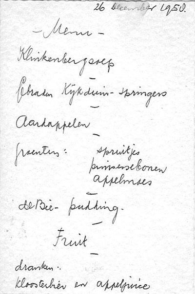 Mijn bewaardrift kent geen grenzen. Zo kan ik u vandaag twee kartonnen menukaartjes laten zien, die ruim vier decennia geleden bij ons thuis op de met rode linten versierde kersttafel hebben gestaan. Omdat ik toen al de artistiekeling uithing, mocht ik de voorkanten van kunstzinnig bedoelde pentekeningen voorzien. Mijn vader schreef, en in 1958 verwerkte hij enkele grapjes in het lijstje: Klinkenbergsoep, Kijkduin-springers en de Bie-pudding. Ter verklaring: we vierden de feestdagen traditiegetrouw samen met de familie Klinkenberg en we woonden vlakbij Kijkduin. Wat aten we? Opvallend is, dat de menu's zo op elkaar lijken - typische kerstdiners uit de jaren vijftig. Er kwam geen exotisch gerecht op tafel, maar de gebruikelijke Hollandse pot. Maar wat maakte deze diners nu zo uitzonderlijk luxueus? 1. Er was een voor- en een nagerecht! Door het jaar heen kregen we op zondag pudding toe (met bitterkoekjes), maar èn soep èn pudding kwam alleen met Kerstmis voor. 2. Ook het gebraden konijn getuigt van een ongekende weelde - nooit dan met Kerstmis kwam 'wild' op tafel. 3. Maar het summum-van-luuks waren de groente-soorten. Drie groentes! Ze zorgden voor een volle, rijke tafel. In 1958 worden de dranken vermeld: kloosterbier en appeljuice. Ik neem aan dat er één flesje bier op tafel stond, waaruit de volwassenen één glaasje dronken. Wijnen? Bij het eten wijn drinken? Nooit van gehoord.