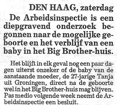 Onbegrijpelijk dat ze bij Talpa dit probleem niet van tevoren hebben onderkend. Bovendien: een bevalling op tv - hoe vaak hebben we dat al niet gezien? Daar zullen de nu al zwaar tegenvallende Talpakijkcijfers niet mee kunnen worden opgekrikt. Waarom probeert men het niet alsnog met overlijden? Er zijn genoeg terminalen te vinden die tuk zijn op veel laatste aandacht. Hoofdredactrice Hummie van der Tonnekreek moet voor de eerste uitzending (morgen) in allerijl op zoek naar een goeduitziende jonge vrouw die nog vier weken heeft te leven en voor de BB-camera's wil sterven. Als de overledene het BB-huis wordt uitgedragen en het vuurwerk losbarst, zullen we 's zien of er niet gekeken wordt! En de begrafenisplechtigheid in de Arena gaat die van Hazes overtreffen. Magere Hein is de Real Big Brother.