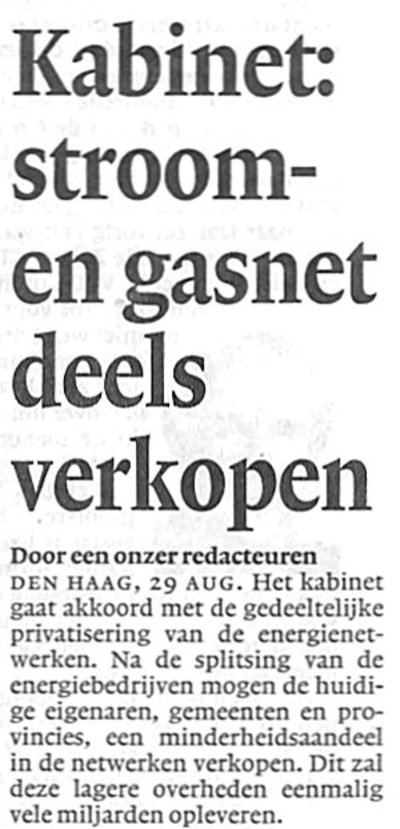 De handel in stroom en gas wordt geheel geprivatiseerd - de netwerken worden voor 49 procent verkocht aan de hoogstbiedenden. Een plan van minister Brinkhorst, dat vrijdag j.l. werd goedgekeurd door het kabinet. Het Nak de Weert Instituut voerde voor Bieslog een zogenaamd watergevoelonderzoek uit. Aan een representatief panel uit de Nederlandse bevolking werd de vraag voorgelegd of men, zonder veel kennis van economische zaken, toch iets aan het water kon voelen bij het vernemen van deze plannen. 78% van de ondervraagden geeft te kennen aan hun water te kunnen voelen dat de privatisering van stroom en gas de consument niet ten goede zal komen. Ook over de besteding van de miljarden euro's die de lagere overheden met de transacties gaan verdienen, toont men zich uitermate sceptisch. Mismanagement, luchtfietserij en fraude zal schrikbarende vormen aannemen, voelt 82% van de panelleden aan het eigen water. En 91% van de ondervraagden meent met grote zekerheid aan hun water te kunnen voelen dat in 2030 nagenoeg alle Nederlanders spijt zullen hebben van de nu genomen beslissingen.