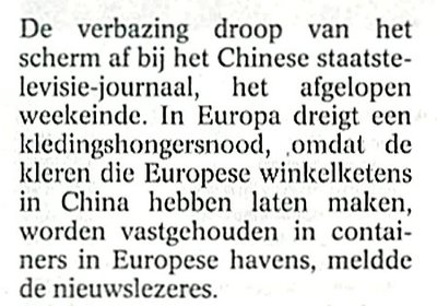 Ik wil een nieuw Chinees t-shirt!!!!!! Mijn Chinese t-shirts van vorig jaar zijn te vaak gewassen, waardoor uitgelubberd. Kan ik echt niet meer aan. Mijn huidige Chinese broek is tot op de draad versleten! En bovendien kwa model hopeloos verouderd - kan ik niet meer mee over straat. IK HEB DRINGEND TWEE NIEUWE CHINESE BROEKEN NODIG!!! De winter nadert, nog even en we moeten weer truien gaan dragen. Ik wil me voorbereiden op de kou, met een Chinese trui naar de mode van winter 2005. IK WIL EEN CHINESE TRUI IN DE KAST!!!!!!! Als de eurocommissaris voor Handel deze noodtoestand laat bestaan, zit er niets anders op dan dat we gewapend met snijbranders en koevoeten naar de Rotterdamse haven gaan en de containers openbreken.