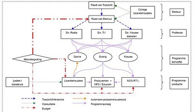 In de officiële publicatie van de regeringsplannen is een schema opgenomen van de organisatie van de Publieke Omroep in 2008. Daaruit valt te lezen hoe groot de nieuwe omroep RVB (Raad Van Bestuur) gaat worden (moet er niet snel een groot nieuw kantoor worden gebouwd?) en hoe zorgvuldig die tot stand is gekomen: de NPS bestaat in 2008 nog wel degelijk en is in het schema opgenomen.