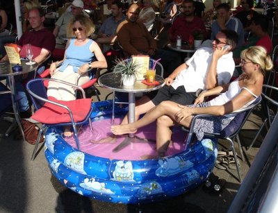 's Ochtends van tien tot twaalf en ?s middags van twee tot vier deden we dus stoelendans. We speelden het spel zo slecht mogelijk, zodat je zo snel mogelijk uitviel. Als de muziek stopte, zocht je overdreven langzaam naar een zitplaats, zodat de anderen je voor waren. Maar omdat iedereen hetzelfde deed, duurde de stoelendans toch heel erg lang. Toen de entertainers doorkregen dat we sjoemelden, moesten we om het kwartier opnieuw beginnen. Kregen we het bevel weer aan te treden, met stoel. De kapitein droeg een wit uniform dat in tien jaar niet was gewassen - vol zweetplekken en etensvlekken, stonk hij een uur in de wind. Hij leek permanent dronken en het werd als een straf ervaren tijdens het diner aan zijn tafel te worden uitgenodigd. Echtparen bracht hij in grote moeilijkheden door onder tafel zijn vrouwelijke gasten onzedelijk te betasten. Tijdens de avonduren waren ons spectaculaire shows beloofd in de theaterzaal. Maar een kwartier voor aanvang loeiden de sirenes, die een grote oefening aankondigden. Het was zaak zo snel mogelijk in een reddingsboot plaats te nemen en als je je reddingsvest niet goed hard had opgeblazen, werd je publiekelijk uitgescholden.