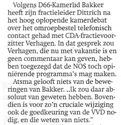Herinnert u zich nog hoe het erop leek dat door een telefoontje tussen Dittrich (D66) en Verhagen (CDA) de tv-programma's 'Nova' en 'Buitenhof' mochten blijven? D66-waterdrager Bakker mocht het weer gaan uitleggen. Wat blijkt nu? Ze hebben mediawoordvoerder Atsma van het CDA gepasseerd! En dat doet men niet ongestraft. In Trouw zet hij collega Bakker totaal voor paal.