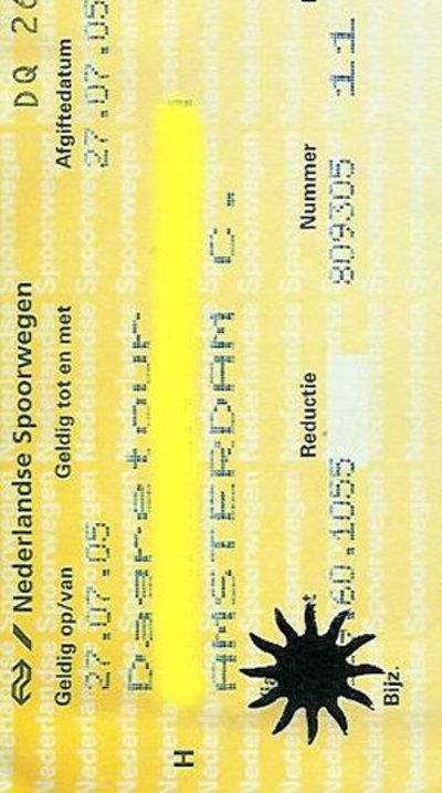 "Zijn er elders in Nederland nog VERTRAGINGEN te verwachten?" Onderweg probeerde ik door de ongewassen ramen naar het regenachtige landschap te kijken. Toen werd ik opgeschrikt door de conductrice die mijn plaatsbewijs wilde zien. Ze knipte in mijn kaartje een zonnetje! Hanteerde zij een eigen, ludieke kniptang? Of is dit ook een nieuwe maatregel van hogerhand ter stimulering van een positieve reisbeleving?