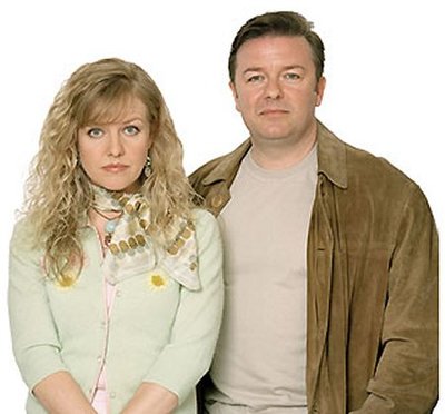 Ashley Jensen en Ricky Gervais als Maggie Jacobs en Andy Millman in Extras. |