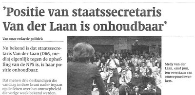 De inhoud van de regeringsplannen voor de Publieke Omroep en de handjeklapachtige manier waarop ze tot stand kwamen, zijn allang niet meer een doorn in het oog van uitsluitend omroepmedewerkers. In bredere kring klinken sterk afkeurende geluiden. In Trouw geven vandaag enkele docenten en hoogleraren parlementaire geschiedenis staatssecretaris Van der Laan het advies op te stappen. Ze is ?door de Tweede Kamer niet meer serieus te nemen?. Als nu verkiezingen zouden worden gehouden, verdwijnt D66 min of meer van het politieke toneel. Als Medy van der Laan de moed heeft af te treden - waardoor het idiote Publieke Omroepplan door een veel beter kan worden vervangen (kan snel en is niet zo moeilijk!) - zal ik voor het eerst van mijn leven D66 gaan stemmen.