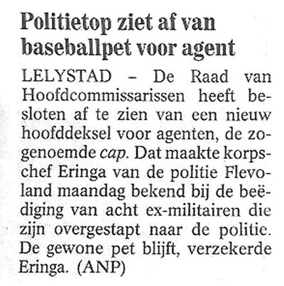 Presidentskandidaat Kerry zette op de laatste dag een baseballpet op het hoofd en je weet: dat had hij tijdens de gehele campagne moeten doen en de overwinning zou vandaag verpletterend zijn geweest. Ook de politietop maakt een kapitale fout door de cap niet tot nieuw hoofddeksel te benoemen. De werving van nieuwe agenten wordt ernstig belemmerd doordat de kandidaten afknappen op die lullige, te ronde, te grote, te gewone pet. Als Balkenende vanaf nu een cap gaat dragen, zijn al zijn imagoproblemen van de baan.
