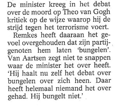 Zitten we te wachten op een bungeldebat over de positie van minister Remkes? In een bijna paginagroot artikel in de Telegraaf wilde de getergde bewindsman gisteren hom of kuit van zijn eigen partij. Volgens de critici binnen de VVD is er eerder sprake van klungelen dan van bungelen. De kritiek spitst zich toe op het feit dat de minister tijdens het Kamerdebat aan concentratieverlies leed, doordat de blaadjes van zijn speech niet op volgorde lagen. (Echt waar!) Waar in de media zal vandaag het bungeldebat worden gevoerd? Den Haag Vandaag zit ernaast, want de minister is vanavond bij Barend & Van Dorp te gast. (Ach jongens, vraag of Remkes zijn speech meeneemt, zodat hij kan demonstreren hoe de blaadjes lagen en hoe zij hadden moeten liggen.)
