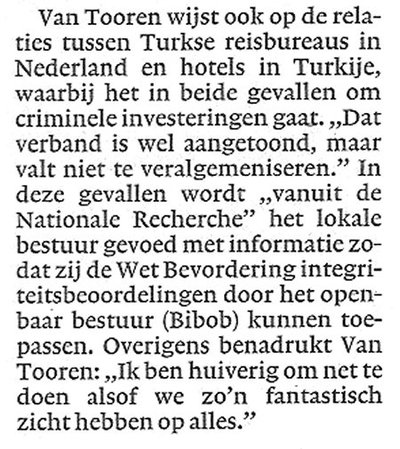 Alleen NRC-Handelsblad doet er vanavond wat aan. Maar verder zet de nieuwe hype niet echt door. Laten we officier van Justitie Van Tooren vragen nog even door te werken tot hij een fantastisch zicht op alles heeft, zodat we weten waarover we gaan hypen. We verheugen ons bij voorbaat op tv-discussies over de Bibob. Waarom hebben we nooit eerder gehoord van de Bibop? Laten we hopen dat het ook bij de Bibop een grote bende is, dan kunnen we even vooruit.