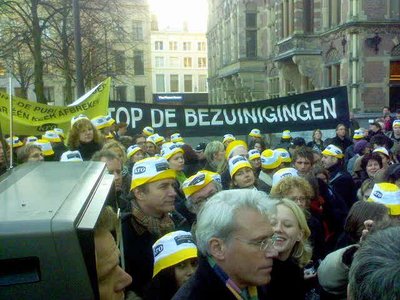 Vanmorgen in de trein, op weg naar de demonstratie van medewerkers van de Publieke Omroep op het Plein in Den Haag, dacht ik: 'Als ze petjes hebben opgezet, maak ik rechtsomkeert.' Toen ik vanuit de Poten het Plein opliep, zag ik het al meteen: een zee van petjes. KRO-hoedjes. Gelukkig zag ik ook, boven de actiehoofddeksels uit, de boomlange gestalte van Chris en ik wist zeker dat hij het ook moeilijk vond daar te staan. Maar wie A zegt moet ook B en C zeggen. We hadden ons kwaad gemaakt op de politieke en bestuurlijke plannen die over de Publieke Omroep zijn uitgestort, nu moesten we toch ook een daad bij het woord voegen. Niemand van de opgekomen VPRO-medewerkers droeg een hoedje, een spandoek of een fluitje, dus klitten we een beetje ongemakkelijk samen.