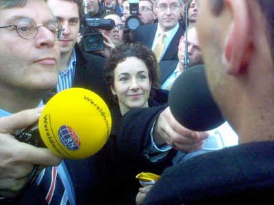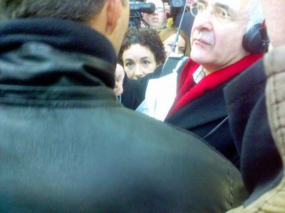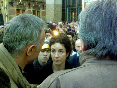 De nieuwe techniek zal nieuwe programmavormen en andersoortige informatievoorziening genereren, daar ben ik van overtuigd. Het is dringend nodig daar inhoudelijke ideeën voor te ontwikkelen, anders mist de Publieke Omroep die boot... Nou, zo dus. Ik begon met een klem op de kaken, maar daarna lukte het me beter mijn statement tamelijk snel en kernachtig uit mijn mond te laten rollen. Toen traden enkele Tweede Kamerleden binnen de kring van protesteerders om een petitie in ontvangst te nemen. Ik trok mijn telefooncamera uit de binnenzak om de gebeurtenis voor Bieslog vast te leggen en heel toevallig kreeg ik in het gedrang uitsluitend Femke Halsema in beeld. Duidelijk is te zien hoe goed zij een petitie in ontvangst kan nemen. En daarbij zegt ze ook nog zeer verstandige dingen over de Publieke Omroep. Zou zij, onder een nieuwe regering, voorzitter van de Raad van Bestuur willen worden als die baan vacant komt? De VPRO-medewerkers verzamelden zich weer en we spoedden ons naar de ingang van de Tweede Kamer om op de publieke tribune plaats te gaan nemen, in afwachting van het mediadebat. Maar toen we onder de ogen van een team veiligheidsbeambten onze jassen en apparaten op de lopende band van een scanner moesten leggen en we onze identiteitskaart gereed moesten houden (heb ik niet), zag ik buiten net meneer Foppe voorbijgaan en werd het me ineens iets teveel.
