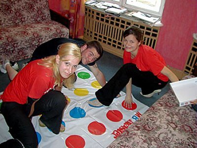 De jaren zeventig revisited. Een mat op de vloer, waarop rijen gekleurde cirkels zijn gedrukt. De scheidsrechter roept: 'Rechterbeen rood!' En de spelers voeren de opdracht uit door hun rechtervoet in een rode cirkel te plaatsen.
