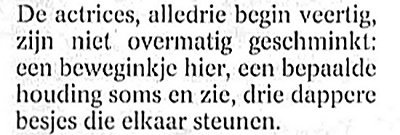 Ik ken er een paar van die leeftijd - in het volle leven staande, actieve mensen en ik zou ze nooit van z'n leven oudjes noemen. Ik duid in het algemeen niet graag mensen met een verkleinwoord aan. (Met Pietje Precies als uitzondering.) Voor vrouwen van boven de zeventig maakt het woord besje haar rentree. In een andere recensie dan de hiernaast geciteerde las ik dat de actrices ook brilletjes dragen die op het puntje van de neus zijn gezet. Kent u vrouwen van boven de zeventig die continu een brilletje op de punt van de neus dragen? Bovendien zijn 70+-vrouwen ook niet automatisch hilarisch en ontroerend. Je hebt er gelukkig ook vervelende en spijkerharde tussen. Laten we een afspraak maken. Mensen van zeventig jaar en ouder noemen we nimmer meer oudjes. En vrouwen van boven de zeventig mogen al helemaal niet meer als besjes in de hoek gezet. Besjes zijn actrices van begin veertig die denken iets te weten over vrouwen van boven de zeventig.