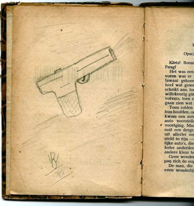 Wij waren thuis zo arm, dat we één kinderboek in het jaar kregen. Een kinderboek voor arme kinderen. Zonder kleurrijk omslag. Zonder illustraties. Als je er zo nodig plaatjes bij wilde hebben, moest je ze zelf maar tekenen. Mijn favoriete kinderboek was een cowboyboek, getiteld 'Een cowboy met vakantie'. Tegenover de eerste pagina maakte ik een illustratie die het boek bondig samenvat: een blaffer. Ik heb het boek bewaard en pas nu zie ik, dat ik het pistool tekende met streepjes uit de loop - het moment waarop een kogel wordt afgeschoten. Maar de vinger aan de trekker ontbreekt. En die trekker steekt omgedraaid in het wapen. Een zelfblaffende blaffer.