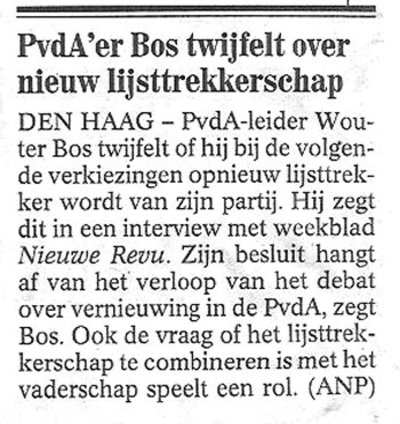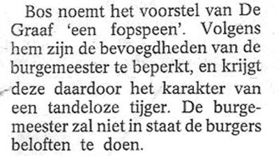 Bos 1 De burgemeester als tandeloze tijger met een fopspeen in de bek - de beeldspraak is rijk, maar ongelukkig gekozen. Wat wil Bos? Een burgemeester als tijger mèt tanden? Een tijger, die plotseling uit zijn zetel opveert, een raadslid in de nek bijt en hem uit de raadzaal sleurt? Bos 2 Bos zit net en twijfelt al. Heeft hij de PvdA-aanhang een fopspeen voorgehouden? Is Bos een poes die Tijger heet?