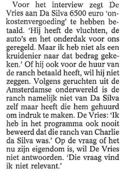 - Laat ik het anders vragen: die reportages van Peter R. de Vries hadden niets met de werkelijkheid te maken?'Nee niks. Ja, we gaan Petertje wat aan z'n neus hangen! Schei toch uit, joh!?