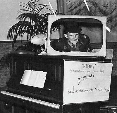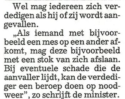Op de redactie hier raakten ze niet uitgelachen. Minister Donner keurt het goed, dat de burger die belaagd wordt door een snoodaard met een mes, van zich af mag slaan met een stok. 'Ha, ha, mijn oma loopt met een stok, maar die komt nooit meer op straat.' 'Ha ha! Nee, de tip is alleen voor dirigenten bedoeld, die hebben altijd een stok bij zich.' Het geschater was niet van de lucht. Ik hield wijselijk mijn mond. Maar in mijn hart heerste vreugde. Ik begreep waar de minister op doelde. Ik wist nu ook zeker dat Piet Hein lid is geweest van onze broederschap. Ook hij heeft als verkenner jarenlang met een stok gelopen. Ook hij kent deze passage van 'Het verkennen voor jongens' van onze leider Lord Baden Powell uit zijn hoofd: 'Geen Verkenner is volledig in uniform als hij geen stok bij zich heeft. De stok behoort bij zijn uitrusting en moet zo lang zijn, dat hij ongeveer tot je neus komt. Je kunt je stok voor allerlei dingen gebruiken, zoals voor een noodbrancard, het afzetten van een terrein, het uitslaan van heidebrand, het afhouden van een nijdige hond enz.' Oud-scout minister Donner heeft aan alle ex-stokdragers het sein gegeven: de stok kan weer aan de schouder, broeders en zusters van de beweging. De nijdige hond is veranderd in een apache met een getrokken mes. Dat de oefeningen met de stok ons moesten voorbereiden op exercities met het geweer, zei vroeger niemand hardop, maar was zonneklaar. Dat weet minister Donner en zo bedoelt hij zijn tip ook. Als de scoutbeweging-van-nu weer terugkeert naar het oude uniform met de stok, mogen ze hun subsidie behouden.