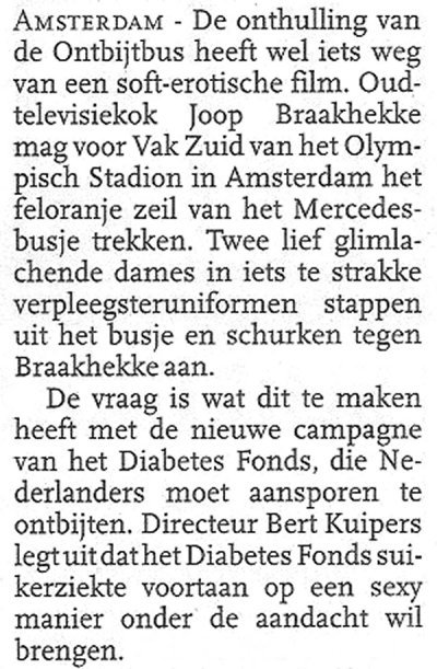 Een woedende Nak de Weert aan de telefoon (directeur van onderzoeksinstituut Nak de Weert). 'Is Albert Heijn met TNS NIPO in zee gegaan! Terwijl wij in onderhandeling waren over een onderzoek naar alle eetgewoonten. Dus warme maaltijd, maar ook ontbijt en lunch. Schandelijk gedrag. Wij hebben een onderzoek naar de tussendoortjes, in opdracht van Super De Boer, laten lopen.'