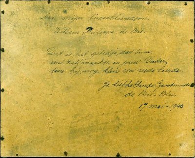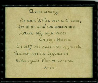 Ik ben niet streng religieus opgevoed. Mijn vader en moeder waren lid van de NPB, de Nederlandse Protestanten Bond. Je kunt dan zeggen (tegen degenen die nog weten waarover je het hebt): 'Ik kom uit een vrijzinnig nest.' Dit ingelijst Avondgebedje kwam vandaag uit een afgelegen kast tevoorschijn. Ik was het glad vergeten. 'Ik dank u Heer voor al het goede, Dat ik op deez' dag genoten heb. Spaar mij, mijn Vader En mijn Moeder En geef ons alles wat wij noodig Hebben om een gezond en Gehoorzaam Kind te worden. Amen.' Geen van die regels herken ik. De tekst is mij dus niet ingestampt. Misschien hing het lijstje naast mijn wieg of ledikant en is het gebed nooit hardop voorgelezen. Uit de beverig geschreven woorden op de achterkant, begrijp ik dat de tekst is gemaakt door mijn oma. 'Aan mijn lieven kleinzoon. Dit is het gebedje dat Oma eens zelf maakte en jouw Vader, toen hij nog klein was reeds leerde. Je liefhebbende Grootmoeder.' En meteen heb ik spijt dat ik het gebed niet uit mijn hoofd heb geleerd, zodat ik het in de jaren die zouden volgen, elke avond voor het slapengaan meerdere malen had kunnen bidden. Want ik ben weliswaar een gezond en gehoorzaam kind geworden, de Heer heeft mijn vader en mijn moeder en mijn liefhebbende grootmoeder helaas niet gespaard.