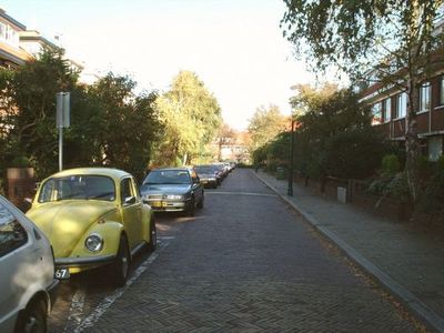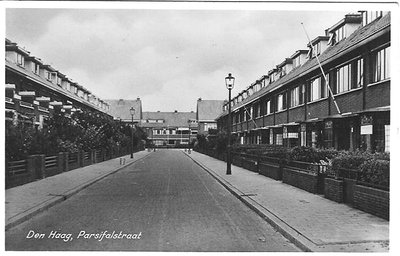 Klikt u aub even de prentbriefkaart groot? Dit is de straat waarin ik mijn jeugd heb doorgebracht (de vaste lezers kennen hem). Er staan wat verdwaalde, nog niet binnengehaalde vuilnisemmers buiten (die in Den Haag asbakken heten). De foto is dus op een doordeweekse dag genomen. 'Waarom is die straat zo eng-leeg?', vroeg een dertiger. Kon ik mijn oudelullenpraatje kwijt. In het jaar dat de foto werd genomen (1947), reden in Nederland 50.000 personenauto's en 50.000 bedrijfsauto's. Zelden kwam een van die honderdduizend auto's door onze straat. Geen van de bewoners bezat er een. Een autoloze straat, zeven dagen in de week. 'Wat een bekrompen tijd', zei de dertiger. 'Jullie konden nooit eens ergens heen?' Nooit. Ja, op de fiets. Kwam je niet ver mee. Als nostalgie een 'terugverlangen naar vroeger is', heb ik er geen last van. Stel je eens aan één straatzijde een rij geparkeerde auto's voor en het ziet er al een stuk gezelliger uit.