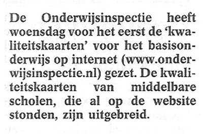 Ouders met schoolgaande kinderen kennen de kwaliteitskaarten van 'hun' scholen waarschijnlijk al. Toch zal menigeen het vandaag niet kunnen laten even de beoordelingen van zijn oude lagere en middelbare school op te vragen. Slaat nergens op, want je oude scholen zijn, sinds je eraf kwam, al honderdmaal van onderwijsmethode veranderd. Toch voelde ik enige trots en tevredenheid toen bleek, dat mijn scholen het er goed vanaf brengen.