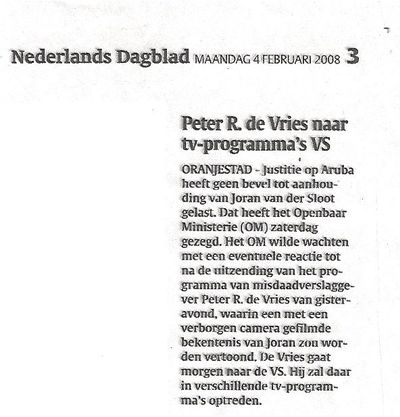 'Om hem bekentenissen uit te lokken, gaf de medewerker van Peter R. de Vries aan Joran grote joints te roken - enorme toeters waren dat - en ik zou voor een justitieel onderzoek waar ik al jaren mee bezig ben, willen weten wat voor stuff dit was. De betrouwbaarheid van getuigenissen kan onder invloed van cannabis namelijk enorm worden verbeterd. Wij gaan het beeldmateriaal nog nauwkeurig bestuderen en een verband leggen tussen Jorans tekst na elke haal aan de joint. Een voorlopige conclusie: des te knetterder stoned men is des te groter is het waarheidsgehalte van de woorden die men spreekt.' Prof. dr. Hako 'Angel' de Ruwe, hoofd van het CIW, het Cannabis Instituut voor Waarheidsvinding