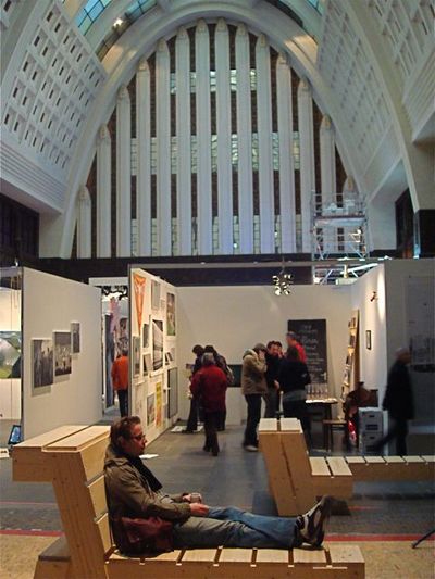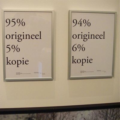 In Rotterdam is in de Cruise Terminal momenteel de kunstbeurs Art Rotterdam te bezoeken - 75 galeries uit Nederland en uit tien andere landen tonen er nieuwe beeldende kunst. Maar er is in de stad nog een kunstbeurs aan de gang: de Project (or) Art Fair in het voormalige postkantoor aan de Coolsingel. 'Een jong, hip en alternatief zusje voor Art Rotterdam'. '28 vooruitstrevende kunstpodia uit binnen- en buitenland presenteren zich met werk van meer dan 100 kunstenaars.' Vanmiddag maakte ik een rondgang door dat immense, prachtige postkantoorgebouw - nu een alternatieve tentoonstellingsruimte, maar uiteraard komt er een groot winkelcentrum in - en ik ontmoette in de stand van kunstenaarsinitiatief Het Wilde Weten beeldend kunstenaar Jeroen Bosch. Hij is de internetpionier die het weblog in Nederland introduceerde - alt0169 - een echt linklog, dat ik dagelijks graag bezocht en dat door velen werd betreurd toen het in augustus 2001 abrupt stopte. Nu beheert hij (met vijf anderen) de site Trendbeheer, waarop wordt verwezen naar kunstactiviteiten, veelal in Rotterdam en Den Haag. Maar het is zo'n energiegevende site, dat 'ie aantrekkelijk is voor de hele Randstad en ver daarbuiten. En passant kocht ik van Jeroen Bosch een werk uit zijn serie content. Het is het rechter (en enige) exemplaar op de onderste foto en ik ben er erg blij mee. Bosch vertelde nadat de koop was bezegeld, dat hij nu ging werken aan het volgende deel: 93% origineel 7% kopie.