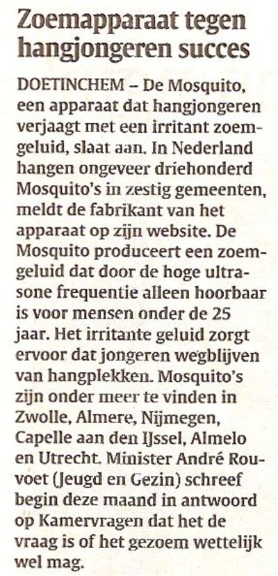 Wij praten met de importeur van de Gadfly, een zoemapparaat dat de Mosquito in mogelijkheden overtreft. Meneer Arrie Wezensvreemd, wat kan de Gadfly wat de Mosquito niet kan? 'Hebt u wel 's gehoord van het probleem van de hangouderen - oudjes die de ingangen van supermarkten versperren met hun bejaardenbrommers en looprekken? Welnu, de Gadfly kan niet alleen jongeren verjagen met een high frequency tone van 17 KHz, door een zoem uit te zenden van -3 tot +2 KHz - een penetrante zoem die alleen 60-plussers kunnen horen - maken we in enkele minuten ook een eind aan de bejaardenoverlast.' Kunnen met de Gadfly meer leeftijdscategorieën worden verjaagd? 'Een zoem van 5 of 6 KHz is alleen hoorbaar voor mannen tussen de achttien en vijfentwintig jaar. Wij hebben een paar Gadfly's uitgeprobeerd in een voetbalstadion tijdens ongeregeldheden - geen centje pijn! De relschoppers verlieten voor rust met hangende pootjes het stadion. Een zoem van 11,4 KHz is voor prostituees onverdragelijk - wij denken dat met honderd Gadfly's de Amsterdamse wallen in een week zijn op te schonen. Er is in Nederland nog altijd een groot illegalenprobleem: richt een Gadfly op een sloopflat en de illegalen springen in no time uit de ramen van ellende. Niet te harden, een zoem van 21 KHz.' Straks gaat u me vertellen dat Moslims ook op een bepaalde zoemtoon reageren! 'Nee, hoor, dat niet. Ik dacht: meneer De Bie houdt wel van wat satire, dus die met zoemen te verjagen prostituees en illegalen die zullen er wel bij 'm ingaan, maar verder ga ik niet. Nee, met adequaat zoemen zijn hinderlijke verschijnselen te elimineren, onze zoemapparaten hebben helaas geen probleemoplossend vermogen.'
