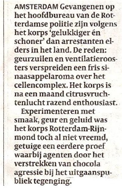 We bellen met Janke Bierenbrood, van beroep: geurmenger. Zijn firma, Smelly BV in Barendrecht, levert het sinaasappelaroma waarmee de Rotterdamse politie haar gevangenen 'gelukkiger en schoner' maakt. Worden de gevangenen op vrijwillige basis blootgesteld aan uw geurgas? 'Nou, nou, nou...geurgas... dat klinkt te heftig. In het Rotterdamse cellencomplex wordt per dag vier liter sinaasappelaroma verspreid, dat is een zeer lage dosis. En de effecten zijn dan al opzienbarend. De gevangenen zingen en fluiten de hele dag.' Maar dat was niet mijn vraag. Gebeurt dit op vrijwillige basis? 'Ja hoor. Na een dag experimenteren, zonder dat ze het wisten, verklaarden alle gevangenen dat ze het 'hartstikke lekker' vonden ruiken. 'Meer, meer, meer!', was in het algemeen de roep. Maar meer dan vier liter krijgen ze niet. We hebben het wèl over gevangenen. Die wonen niet in een hotel.' Zijn er andere maatschappelijke terreinen waarop met uw geuren wordt gewerkt? 'O ja. In hotels dus. In de grote warenhuizen verspreiden we frambozengeur, waarmee we - gecombineerd met muzak - omzetstijgingen bereiken tot 46%! We kunnen ook vieze geurtjes produceren. Die werken minstens zo goed als de zoemapparaten. Laat in de buurt van een hangplek een geur van rotte eieren gemengd met kippenstront los en de problemen zijn opgelost.' Alle maatschappelijke problemen zijn met het juiste geurtje op te lossen? 'Ben ik van overtuigd. Neem nu de wens van minister Rouvoet: de Nederlanders moeten meer kinderen maken. Als de echtparen die een kind willen van regeringswege een flacon met onze uni-geilgeur krijgen verstrekt, kunnen de ooievaars het werk niet aan! Tussen haakjes: ik weet een betere oplossing voor Rouvoets probleem: laat op de Publieke Omroep iedere avond een goede, smaakvolle, moderne pornofilm vertonen... Zien neuken, doet neuken, zei mijn moeder altijd al. Dan is een extra geurtje helemaal niet nodig!'