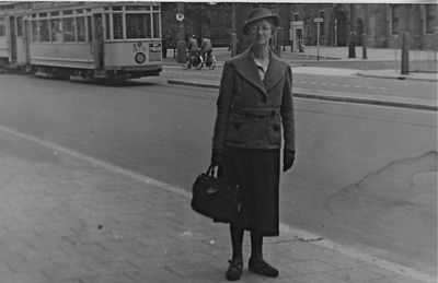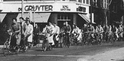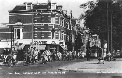 Zover is het nu gekomen: oude foto's uit Den Haag zoek ik met een loep af. We kunnen erop staan - mijn vader, mijn moeder, mijn zusje, of ikzelf. Onze eigen foto's ken ik nu door en door, ik zoek nieuwe bewijzen. Den Haag - ambtenarenstad. Spitsuur Laan van Meerdervoort, de dagelijkse stroom fietsers vormde een toeristische attractie. Mijn vader reed gedurende veertig jaar alle werkdagen dit stuk van huis naar kantoor en - zoals op de foto - vice versa. Ik vergroot de details. Daar helemaal rechts, die lange kaarsrechte figuur. Zou hem kunnen zijn. Ja, goed, en wat dan nog? En die tram daar op de achtergrond... Misschien zat mijn moeder erin, op de terugweg, na winkelen in de stad. Maar dan klopt mijn terugfietsende vader niet - mijn moeder zal altijd thuis zijn geweest als mijn vader van kantoor kwam. En zo vaak zal mijn moeder niet naar de stad zijn gegaan om te winkelen? Die hobby bestond nog niet. Wij leefden van een ambtenarensalarisje. Daarom is die winkel van De Gruyter zo'n goed decorstuk. Die gaven korting op alle levensmiddelen. Daar moesten wij het van hebben.
