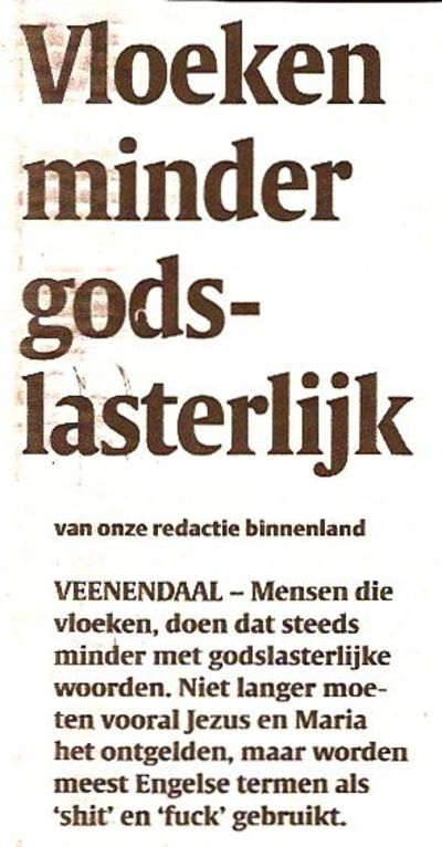 De scherpslijpers van de Bond tegen het Vloeken denken nog steeds ten onrechte dat boze mensen die de gvd-vloek bezigen, hun Christelijke God bedoelen. Ikzelf denk ook nooit aan God, als ik weer 's een gvd laat rollen, omdat bijvoorbeeld een geopend pak melk uit de ijskast valt (vanmorgen), of omdat na het zwemmen mijn voorband lek blijkt te staan (gistermiddag). Het gemakkelijke gebruik zit 'm in de klankcombinatie - de twee oh's en de rollende r komen er spontaan opluchtend vet uit. Ja, het is waar, ik gebruik ook steeds vaker shit. Moet ik niet meer doen. Fuck zeg ik zelden. Wel veel Kut. En dat moet ik ook laten. Kut heeft zijn langste tijd nu wel gehad.