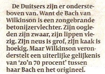 De Volkskrant brengt het nieuws vandaag met een 6-koloms kop op de voorpagina: 'Plots is Bach betonijzervlechter'. Een forensisch antropologe heeft een reconstructie van het gezicht van Johann Sebastian Bach gemaakt en dat lijkt in alles op 'een zongebrande betonijzervlechter'. 'Zijn oogleden zijn zwaar, zijn lippen vlezig. Zijn neus is grof, zijn kaak is hoekig.' In mijn omgeving wordt veel gebouwd en - leunend op mijn fiets - mag ik elke dag graag een kwartiertje naar de vorderingen van de bouwers kijken. Ik ken dus de fysionomie van de betonijzervlechters met hun vlezige lippen, grove neuzen en hoekige kaken maar al te goed. Voor één bijzonderheid heb ik nu eindelijk een verklaring gekregen. Tijdens het werk staat op de bouwplaats uiteraard een radio urenlang te blazen. En in de bouwperiode van de betonijzervlechters klinkt altijd de muziek van Bach uit de met betonvlekken bekladde stootvaste versterkers. Ik heb de betonijzervlechters al horen meefluiten op de eerste Mattheus van het jaar!