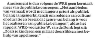 Als maker van amusement voor de publieke omroep was ik benieuwd naar wat het rapport over het Nederlandse mediabeleid van de WRR (Wetenschappelijke Raad voor het Regeringsbeleid) voor me in petto heeft. Nou, dat valt niet mee. 'Amusement is geen kerntaak meer van de publieke omroepen.' Ik kan het wel vergeten. De boodschap van de WRR is duidelijk: 'Bedankt tot zover en het ga je goed.' Maar er gloort een sprankje hoop. Amusement moet geheel aan de commerciëlen worden overgelaten, 'tenzij om redenen van cultuur of educatie en bereik dat genre van belang is voor het realiseren van publieke belangen'. Ik heb lang op die zin gestudeerd, maar kwam er niet uit. Nu pas blijkt dat ik het maken van amusement veel te licht heb opgevat. Ik heb altijd maar 'wat gedaan' - van de publieke omroep de volle vrijheid gekregen om te bedenken en schrijven wat in me opkwam. En nu moet ik meewerken aan het 'realiseren van publieke belangen'? Ik begrijp het niet. Gelukkig legt WRR-voorzitter W. van de Donk het uit: 'Zoals je kinderen een pil laat doorslikken met behulp van appelmoes.' Poei! Ik moet me omscholen. Ik moet leren het publiek als kinderen te zien, de publieke belangen als pil en 'dat genre'(amusement) als appelmoes. Wat zijn de beste appels voor het maken van appelmoes? Ze mogen niet te zuur zijn, anders lusten de kinderen mijn moes niet.