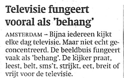 Uit een grootschalig onderzoek door TNS Nipo blijkt, dat tv-kijkers er van alles naast doen. Onderzoeker dr. Nak de Weert kraakt een kritische noot. 'Niet interessant, dat onderzoek,' zegt de directeur van het Nak de Weert Instituut, 'dat de kijkers praten, lezen, strijken, breien en vrijen, kan iedereen met een tv in huis zelf wel invullen. Veel interessanter is de vraag: wat doen de Nederlanders NIET tijdens het tv-kijken?'