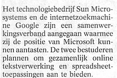 'Google opent de aanval op de gehate gigant. Maar als ze zo doorgaan, wordt Google groter dan Microsoft. Komen we van de regen in de drup. Hebben we weer een andere firma om tegenaan te schoppen. Vanaf vandaag gebruik ik Google niet meer. De patsers!' Driek, computerfreak van het eerste uur