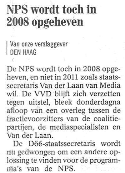 Zoals voorspeld: een verlenging van de doodsstrijd van de NPS, maar doorgang van de catastrofale, onbegrijpelijke en onuitvoerbare regeringsplannen voor de Publieke Omroep. De laatste hoop: traineren. In Tweede en Eerste Kamer lang over het wetsvoorstel blijven urmen. Tot de verkiezingen in 2007. Waarna een nieuwe regering de plannen van tafel kan vegen, naar de programmamakers gaat luisteren en met een helder en eenvoudig plan de Publieke Omroep probeert te redden.
