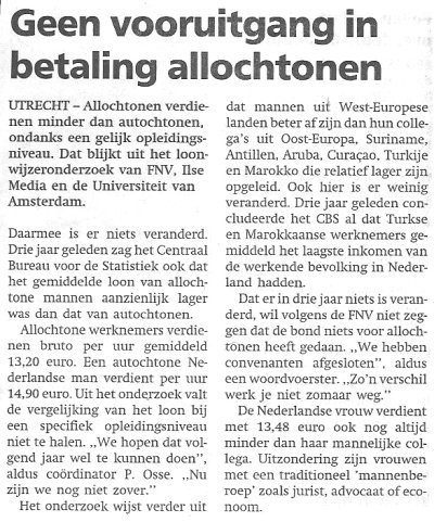 Is mijn indruk juist en 'loopt het lekker'? Je bent nog niet eens EmPie, JeePee, maar in feite regeer je al. Hoe met behulp van de oude VVD-regeringsfractie en de nieuwe LPF-kamerfractie de aanschaf van de Joint Strike Fighter er door is gejast, is een kranig staaltje nieuwe bezems vegen schoon. Even het volgende. Uit bijgaand artikel in Trouw blijkt, dat er nog steeds een substantiële achterstand bestaat tussen het loon van allochtone en autochtone werknemers. Dat kan natuurlijk niet. Je weet dat allochtone werknemers vaak het werk doen dat autochtonen te min is, maar dat van essentieel belang is voor onze samenleving. Zonder allochtone arbeid geen verse waren in de supermarktschappen, geen schone kantoren en overheidsgebouwen, geen krant werd bezorgd, de tomaten zouden verrotten in de kassen, enzovoorts, enzovoorts. Het wordt zo langzamerhand tijd het Christelijke, sociale gezicht van het CDA te laten zien, JeePee, voordat het met asfaltakkoorden is dichtgesmeerd. Zou je in het nieuwe regeerakkoord aan deze schandelijke achterstelling in beloning een einde willen maken? Of is het een te links voorstel en durf je het niet aan? PS Dat de vrouw in beloning nog steeds wordt achtergesteld ten opzichte van de man is net zo schandelijk, maar kan door jou niet worden gerepareerd, neem ik aan - strijdig met je Christelijke familienormen en waarden. Daar wordt de komende vier jaar dus niets aan gedaan.