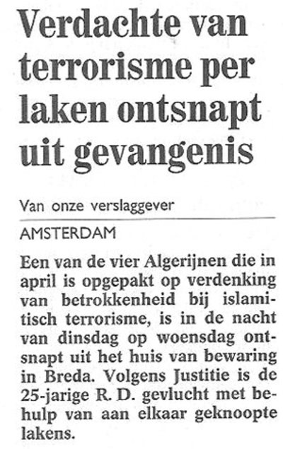 Met behulp van aan elkaar geknoopte lakens... Lakens, de oudste ontsnappingshulpmiddelen van de wereld. Toen ik op internaat zat, ontsnapten we er mee van de jongensslaapzaal. De rector maakte een rigoureus einde aan de ontsnappingen door ons onder dekbedden te laten slapen. Probeer maar 's twee dekbedden aan elkaar te knopen. Het kostte Dickie van Ralenstein een gebroken been.