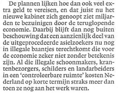 'Binnen afzienbare tijd zullen de LPF-Kamerleden uit puur eigenbelang niet meer hameren op het geloofsartikel dat Nederland te vol is en derhalve de grenzen hermetisch moeten worden gesloten. Per slot van rekening vertegenwoordigen ze de nieuwe rijken en die weten als geen ander dat zonder illegalen de asperges niet voor een habbekrats gestoken worden, de bloembollen niet geraapt en de eeuwig corrupte bouwwereld in grote problemen komt.