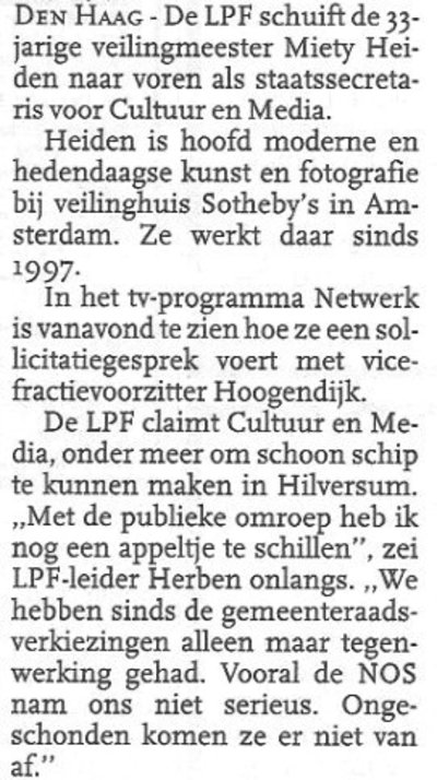 'Zijn vertrek komt extra hard aan omdat zijn politieke beweging het van zijn persoonlijke alomtegenwoordigheid moet hebben. Wat blijft er van Leefbaar Utrecht, Leefbaar Rotterdam, Leefbaar Nederland, of de Lijst Pim Fortuyn over als de charismatische leider wegvalt' Net als Fortuyn, is Westbroek een politicus die stem geeft aan de onvrede van de kiezers, tégen het in hun ogen vastgeroeste en ingeslapen bestuur in. Als deelnemer aan het stadsbestuur kan je natuurlijk concrete resultaten boeken. Zo is er in Utrecht een referendum over de inrichting van het centrum gehouden. Ook de LPF zal in de landsregering belangrijke programmapunten in beleid kunnen doorzetten. (-Het doordrukken van de JSF? -WdeB) () Zowel in Utrecht als in Rotterdam als aan het Binnenhof lopen de voormalige buitenstaanders het gevaar door de gevestigde politiek doodgeknuffeld te worden. Dat is waarschijnlijk de effectiefste manier ze onschadelijk te maken. Maar voor het scherp houden van politici kunnen mensen als Westbroek eigenlijk niet gemist worden.' Waar staat de Volkskrant vandaag precies na de herijking van de Grote Begrippen? Links? Rechts? Centrum-midden? Luidt het hoofdredactioneel commentaar een nieuwe fase bij de Volkskrant in? Na katholiek, via links naar populistisch?